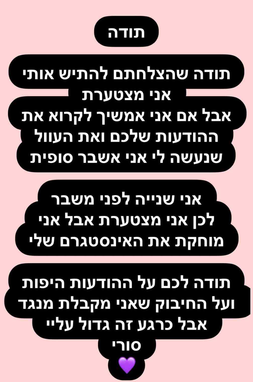 "מבקשת חד משמעית להפסיק עם זה. זו הפעם האחרונה שאני מתייחסת לקרקס המביך הזה. האירועים היו לפני שנתיים זה כל כך מאחורינו. חתימה טובה ;)"