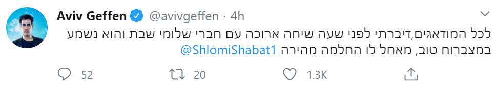 עם זאת, יש מעט בשורות טובות מאת עמיתו לחבר השופטים ב"דה וויס" הזמר והיוצר אביב גפן שהחליט לשתף את עוקביו בטוויטר ממש בשעות האחרונות בבשורות מעודדות לאחר שיחה עם שלומי שבת.