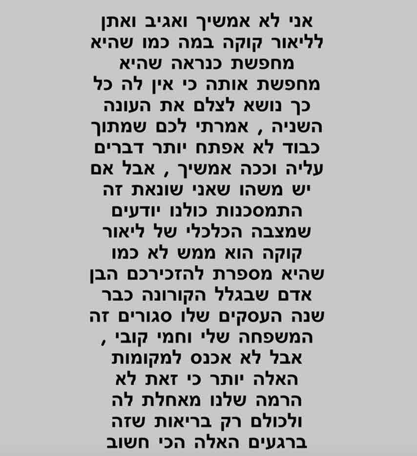 והוסיפה עקיצה בסטורי:"אני לא אמשיך ואגיב ואתן לליאור קוקה במה כמו שהיא מחפשת כי אין לה כנראה כל כך נושא לצלם את העונה השניה"