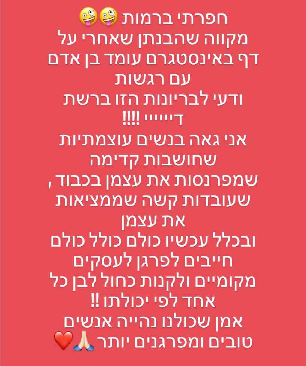 אני באמת מבקשת לכל מי שרואה את זה, וגם תעבירו את זה לילדים שלכם, וככה אני גם מגדלת את הבנות שלי. דיי לשיימינג הזה, דיי לצרות עין. שכל אחד יתעסק בעצמו