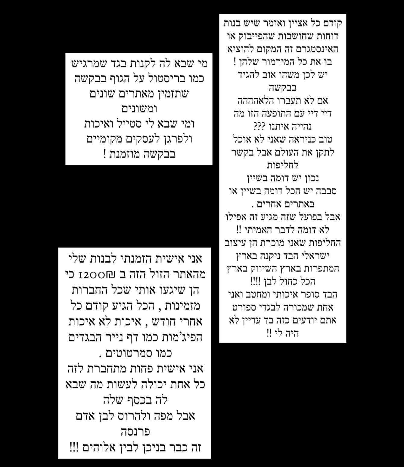 "הכי עצוב הבנות המפגרות שקונות את זה ב500 שקל ממנה ומוכרים את זה בגרוש וחצי בשיין אין יותר מרתיח מזה עוד תקעה מחיר כאילו מה"