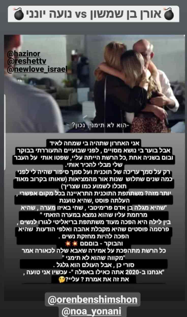 לאחר לא מעט סערות שיצר משתתף "אהבה חדשה" של רשת 13, אורן בן שמשון. היה נדמה כי הרוחות בינו לבין מי שהייתה משודכת לו בריאלטי, נועה יונני כבר הספיקו להירגע, אבל בפועל מסתבר שהוא חיכה לרגע הנכון להכות חזרה?