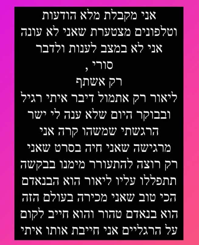והוסיפה בכאב:"אני מרגישה שאני חיה בסרט שאני רק רוצה להתעורר מימנו. בבקשה תתפללו עליו ליאור הוא הבנאדם הכי טוב שאני מכירה בעולן הזה. הוא בנאדם טהור והוא חייב לקום על הרגליים. אני חייבת אותו איתי"