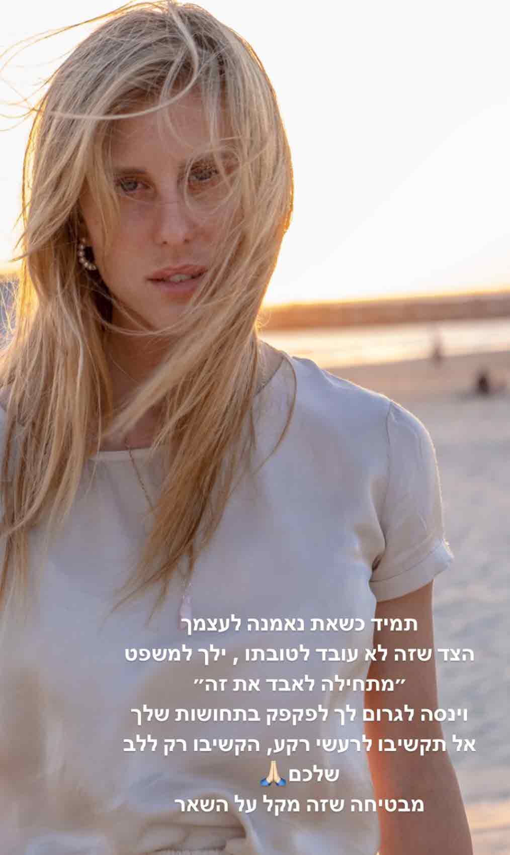 אלינה לא שתקה והעלתה את התגובה הבאה:"תמיד כשאת נאמנה לעצמך הצד שזה לא עובד לטובתו, ילך ולמשפט 'מתחילה לאבד את זה' וינסה לגרום לך לפקפק בתחושות שלך. אל תקשיבו לרעשי רקע, הקשיבו רק ללב שלכם. מבטיחה שזה מקל על השאר"